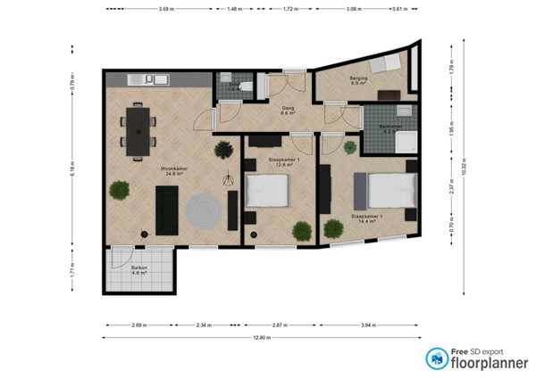 Twee royale slaapkamers. De grootste slaapkamer heeft een oppervlakte van ca. 15 m² en de tweede slaapkamer heeft een oppervlakte van ca. 13 m².